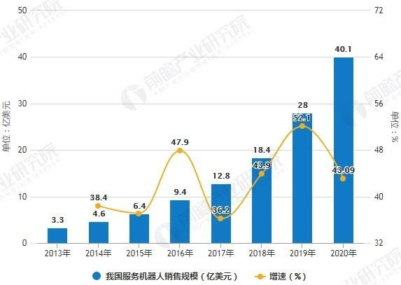 隨著人工智能技術(shù)的發(fā)展,我國服務(wù)機(jī)器人市場(chǎng)也迎來了爆發(fā)式增長,據(jù)前瞻產(chǎn)業(yè)研究院發(fā)布的《中國服務(wù)機(jī)器人行業(yè)發(fā)展前景與投資戰(zhàn)略規(guī)劃分析報(bào)告》統(tǒng)計(jì)數(shù)據(jù)顯示,2013-2018年整體處于飛速增長階段,2018年中國服務(wù)機(jī)器人市場(chǎng)規(guī)模有望達(dá)到18.4億美元,同比增長約45.3%,G于服務(wù)機(jī)器人市場(chǎng)增速。